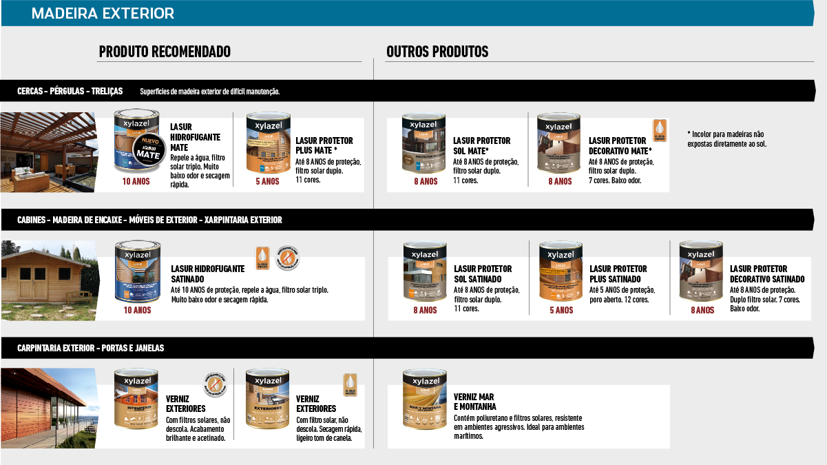 • Lasures protetores semitransparentes, de poro aberto ou microporos ou penetram na madeira permitindo ver o veio. Disponíveis em mate, acetinado e brilhante e numa vasta gama de cores, bem como incolor.